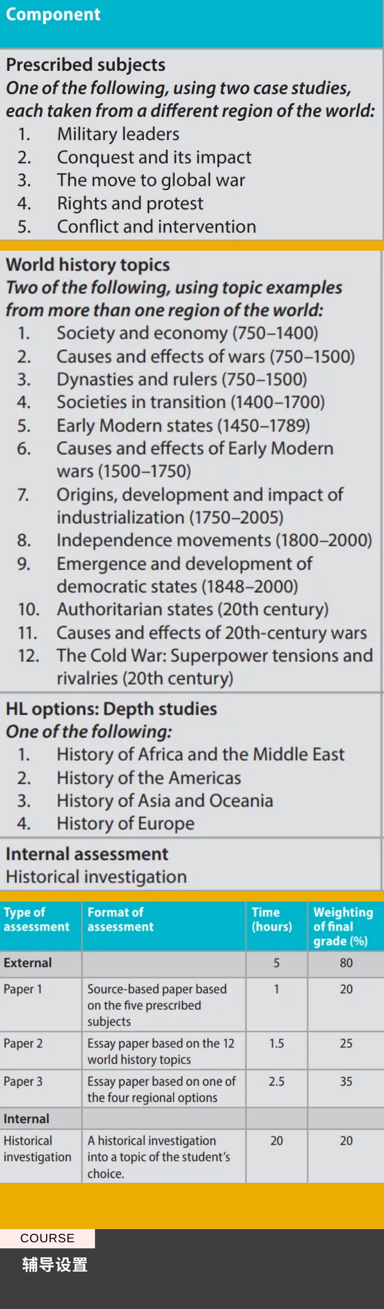 IBDP歷史主要分為Prescribed Subjects(規定主題)和World History Topics(世界史主題)。其中規定主題為五選一,世界史主題十二選二,共學習三個主題。如果這門科目選擇HL,則需要再多加三個主題,其中也必須在Depth Studies(深度研究)中選擇一個主題。